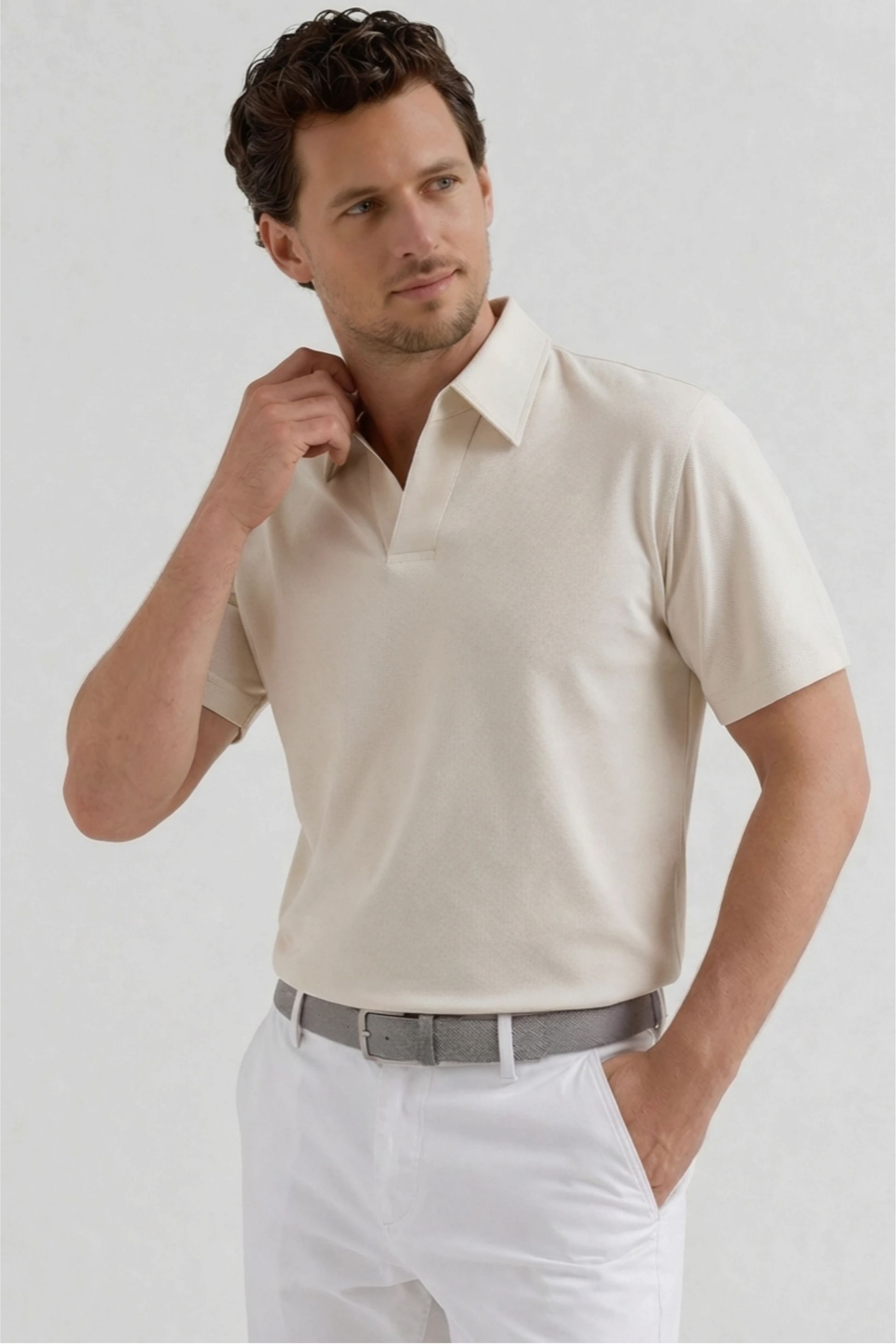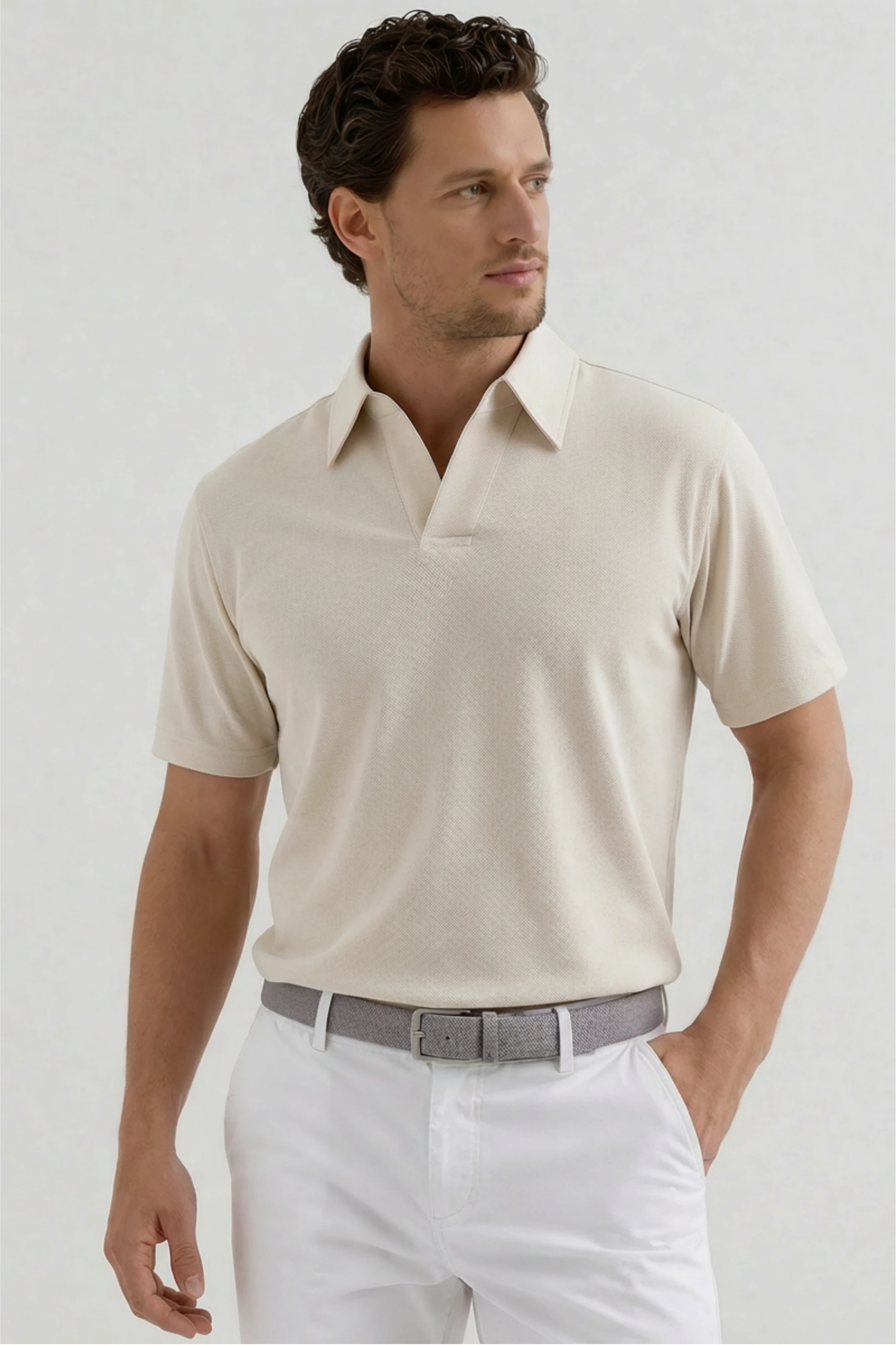 A refined essential with a modern edge, this polo features a clean open placket that creates a relaxed yet polished neckline. Crafted from a lightweight knit with a subtle sheen and soft hand feel, it offers breathable comfort with a more elevated appearance—designed to transition effortlessly from the course to everyday settings.